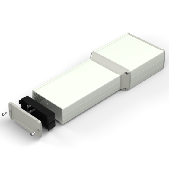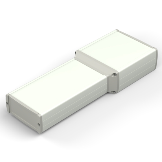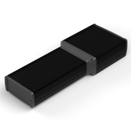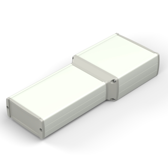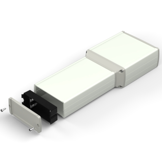 Formschönes Profilgehäuse aus eloxiertem Aluminium mit qualitativ hochwertiger Oberflächelackierung, besonders geeignet für Anwendung als Handgehäuse. Ideal für Fernbedienung mit Tastatur oder Display. Integrierte Führungen für PCB. Die Modelle mit „-B“ haben ein Batteriefach für zwei 1,5V (AA) oder eine 9V (PP3) Batterien. Montage mit zwölf Schrauben.
