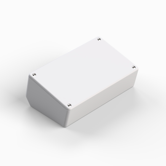 Kunststoffgehäuse mit um 15° geneigter Platte. Das Unterteil hat integrierte Führungen und Montagepfeiler für PCB. Die Ecken sind abgerundet. Glänzende Oberfläche. Montage mit 4 Schrauben.