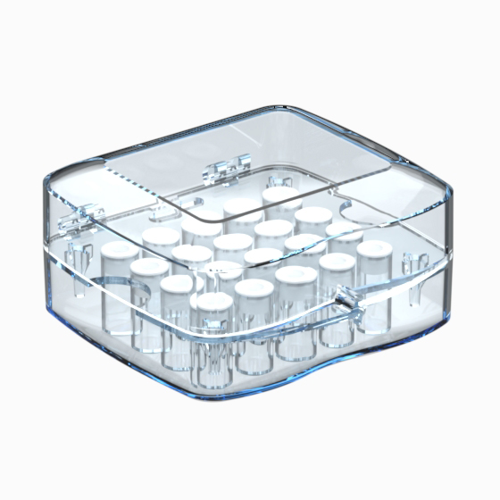 Attrayant et moderne, ce boitier est moulé en methacrylate transparent. Chaque boitier détient vingt tubes avec une hauteur de 25 mm ou de 40 mm, idéal pour le classement de petits composants électroniques.