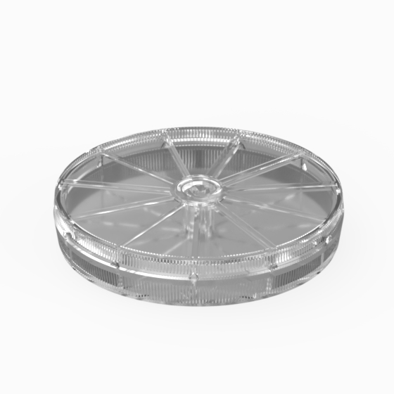 Boîtier de rangement de forme ronde, moulé en méthacrylate transparent et équippé avec 10 cases pour le classement de petits composants